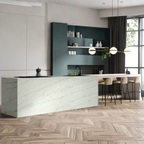 Experience the captivating charm of Azurmatt quartz. Its gentle gray veins with enchanting aquamarine undertones replicate the essence of authentic quartzite, raising the visual appeal and refinement of any environment. With its expansive dimensions, it radiates magnificence and confidently leaves a lasting impression on countertops, waterfall islands, and accent walls, perfect for installation in residential and commercial spaces.